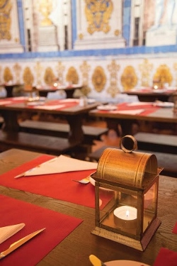 A própria decoração apela a essa vivência. Tochas, candelabros com velas e lanternas (as antigas) remete para um Portugal da Idade Média. Que é complementada pela música ambiente. Gregoriana, pois claro.