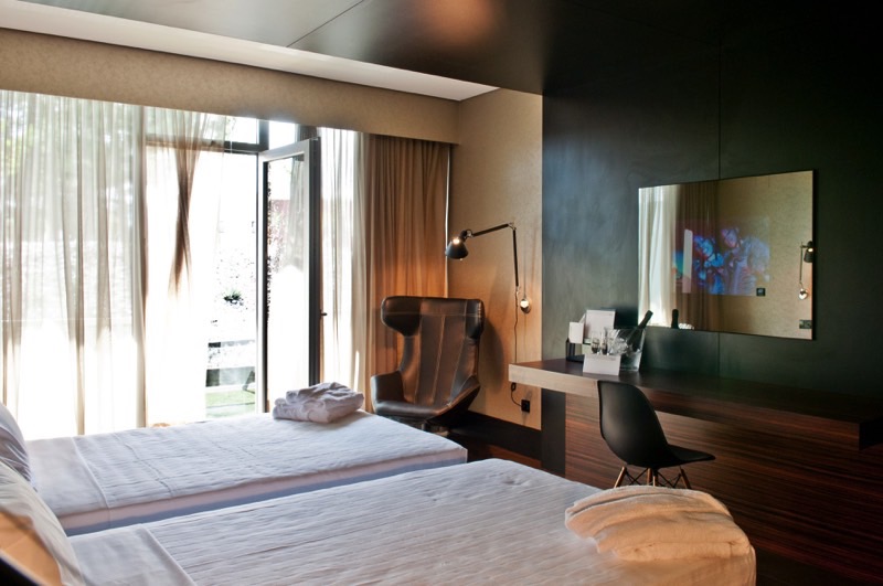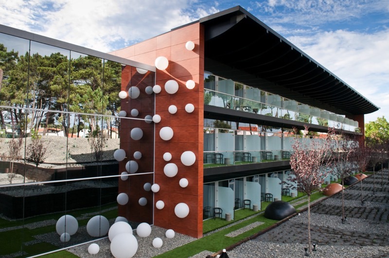 A entrada do hotel é aprazível. Decorada com peças de arte e vista para o jardim. Os quartos todos decorados em tons sóbrios têm todos varanda. O chão desta está forrado com uma espécie de relva sintética. Ou seja pode-se andar descalço. O que no Verão é muito agradável.